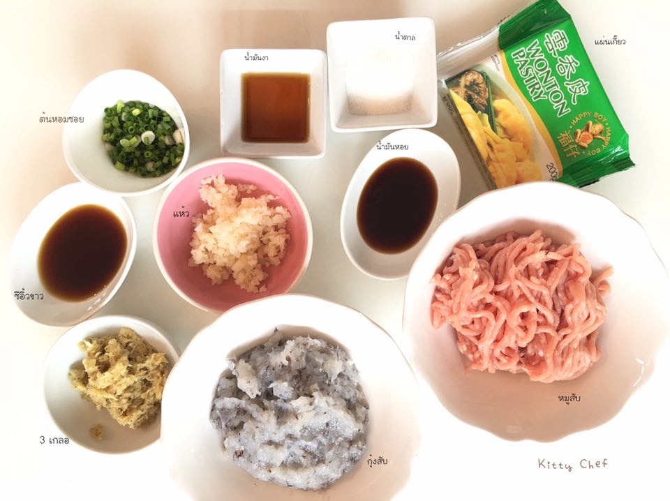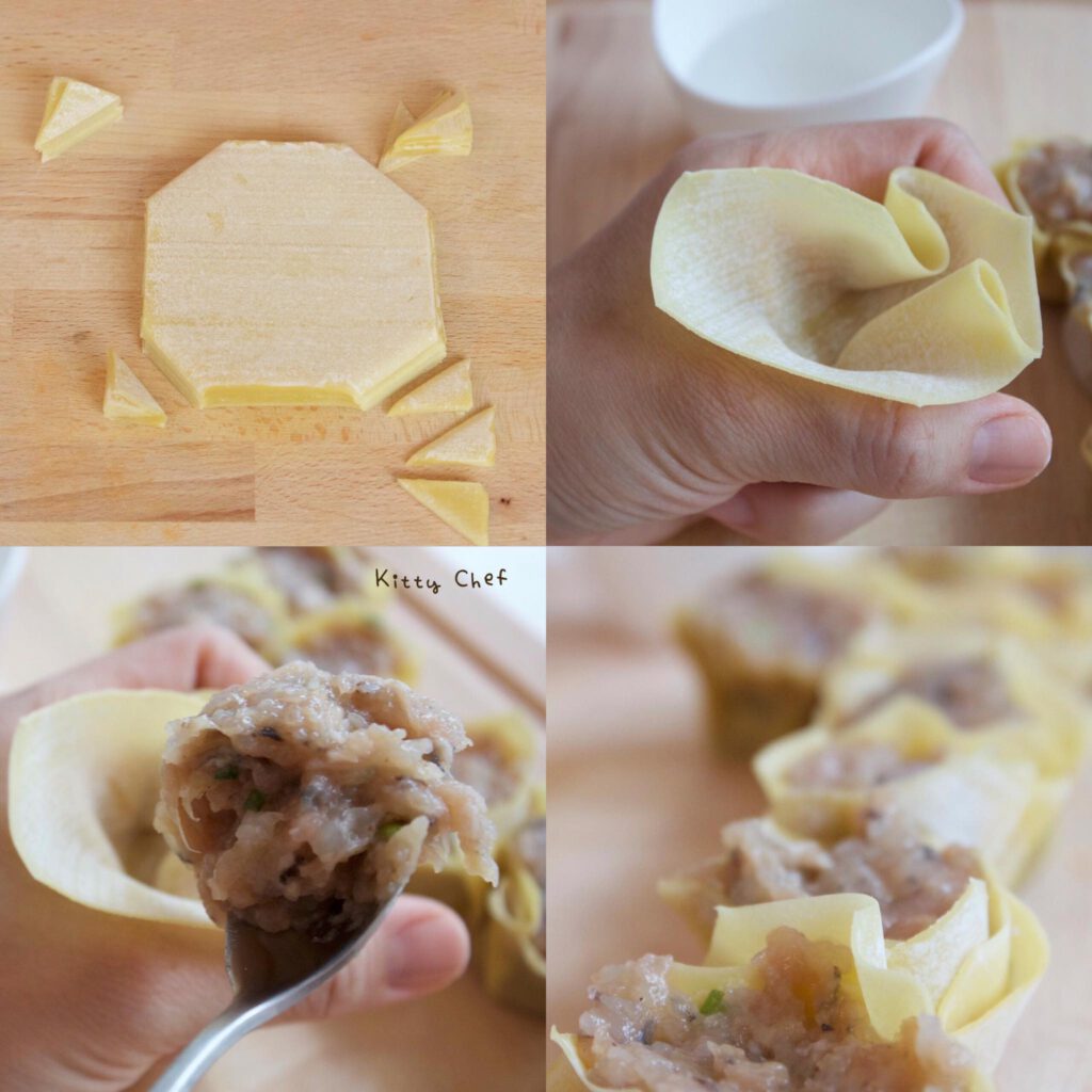 -แผ่นเกี๊ยว ตัดมุมออกทั้ง 4 ด้าน นำแผ่นเกี๊ยวมาวางที่มือเติมไ ส้ให้เต็ม ใช้น้ำเปล่าจับจับให้สวยงาม