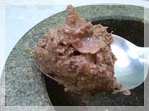 1. นำส่วนผสมของ พริกไทยเม็ดขาว หัวหอมแดง กะปิ กุ้งแห้ง มาโขลกรวมกัน