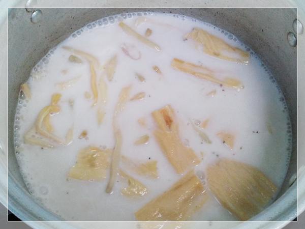 2. ตั้งหม้อใส่กะทิไปเล็กน้อย นำเครื่องแกงที่โขลกไว้ลงละลายผัดกับกะทิให้เข้ากัน ใส่หมูสั บลงผัดให้สุ ก แล้วใส่กะทิที่เหลือลงต้มให้เ ดื อ ด