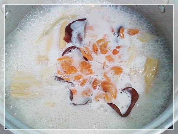 3. เ ดื อ ดแล้วใส่กุ้งแห้ง ด อ กไม้จีน ฟองเต้าหู้ เห็ดหูหนู ลงไป
