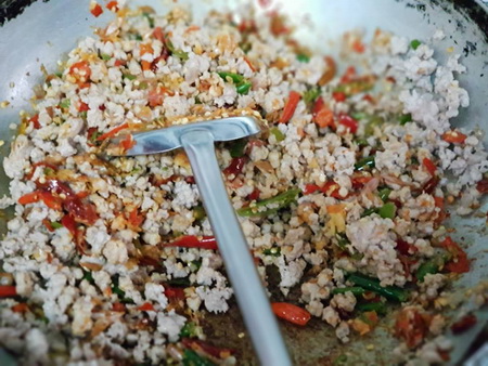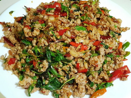 ข่ าจะเพิ่มความเผ็ดร้ อ นให้ผัดกะเพราจานนี้ พริกแดงให้ความเผ็ดและสีสันชวนรับประทาน พริกขี้หนูให้ความหอมฉุ นเผ็ดร้ อ น