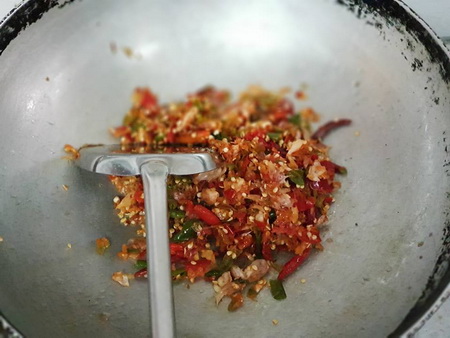 2. นำกระเทียม ข่ า พริกทั้ง 2 ชนิด ใส่ครก โ ข ล กให้แ ห ล กพอหย าบๆ ไม่ต้องละเอียดมากก็ได้
