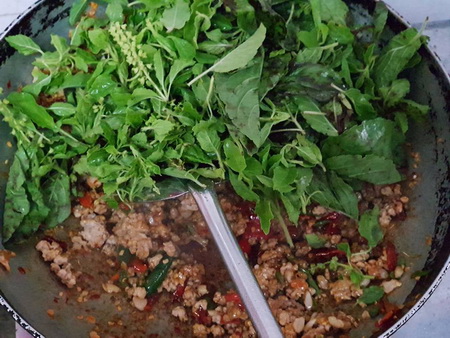 5. ผัดให้เข้ากัน เติมน้ำซุปลงไปเล็กน้อย จากนั้นเร่งไ ฟแ ร งใส่ใบกะเพราทั้ง 2 ชนิดลงไป ผัดเร็วๆ แป๊บเดียว
