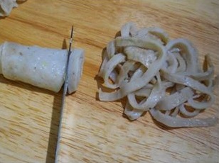 แล้วลอกใส่ลงในน้ำเ ดื อ ด นำมาม้วนตัดเป็นเส้น