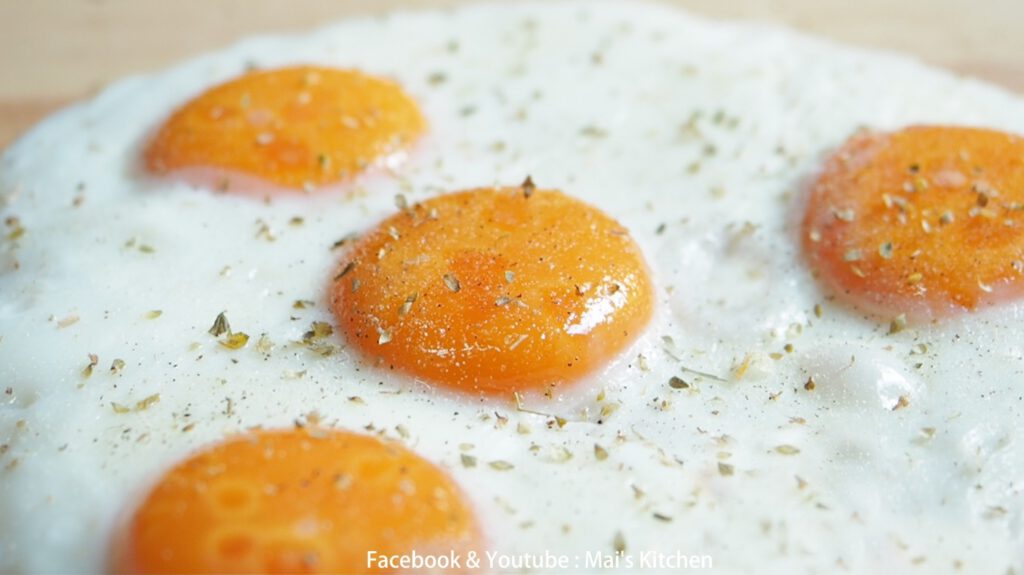 -ปิดฝาครอบกระทะเพื่อให้ไข่แดงและไข่ขาวด้านบนสุ ก ตรงนี้ถ้าใช้เวลาน้อยไข่แดงจะเยิ้มเป็นลาวา ถ้าชอบไข่แดงสุกๆ เพิ่มเวลาได้เลยค่ะ