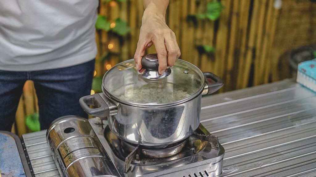 5.แล้วล้างให้สะอาดอีก 2 รอบแล้ว เทน้ำออกให้หมด แล้วเปิดเต าตั้งหม้อ