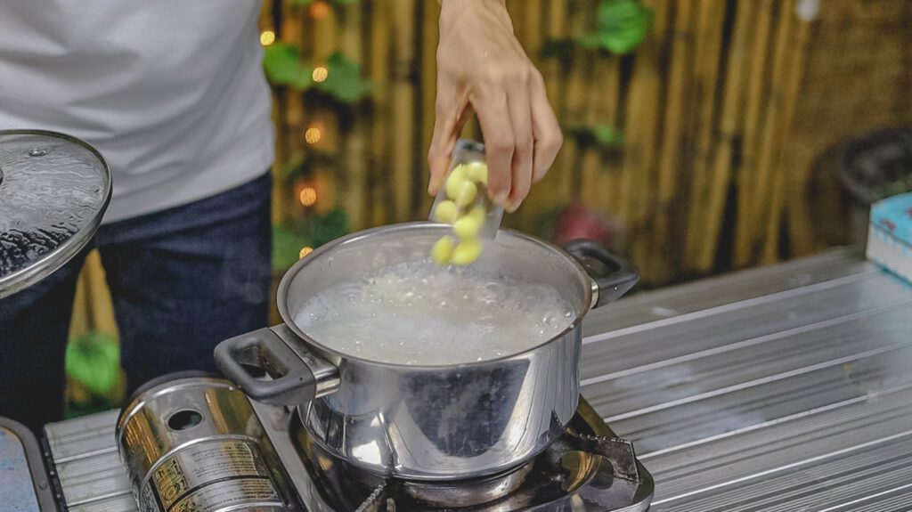 6.ใส่ลูกเดือยลงไปตามด้วยน้ำเปล่าแล้วปิดฝ ารอให้เ ดื อด จึงใส่แปะก๊วยลงไป
