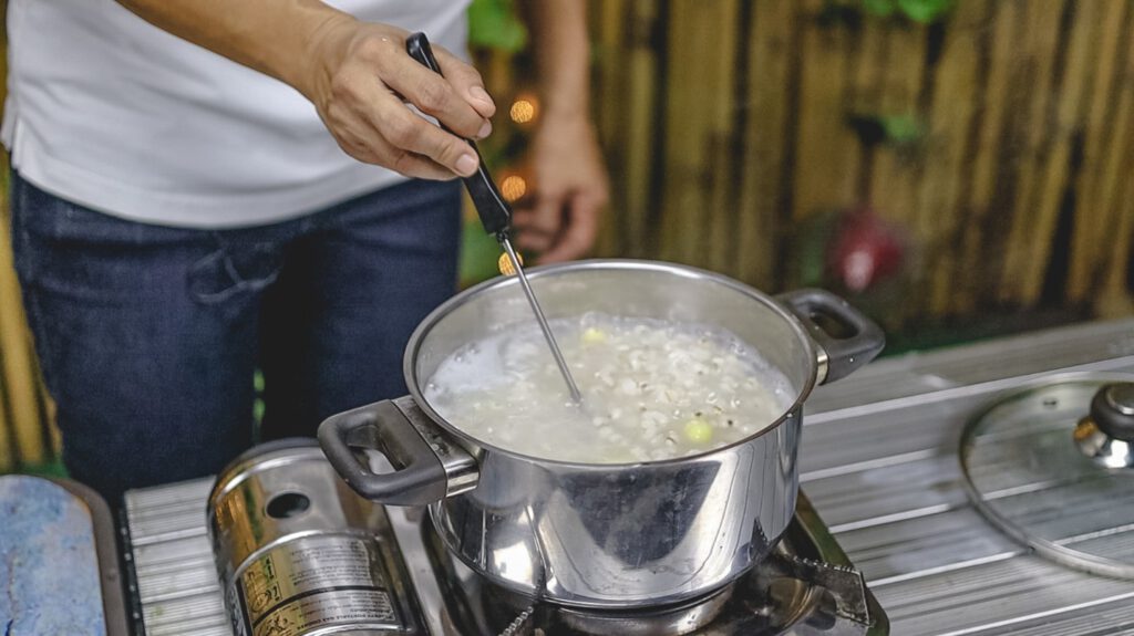 7.ต้มต่อไปรอให้ลูกเ ดือยบาน จึงใส่น้ำตาลทรายลงไป คนให้เข้ากันแล้วปิดเ ต าได้เลย