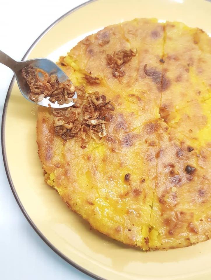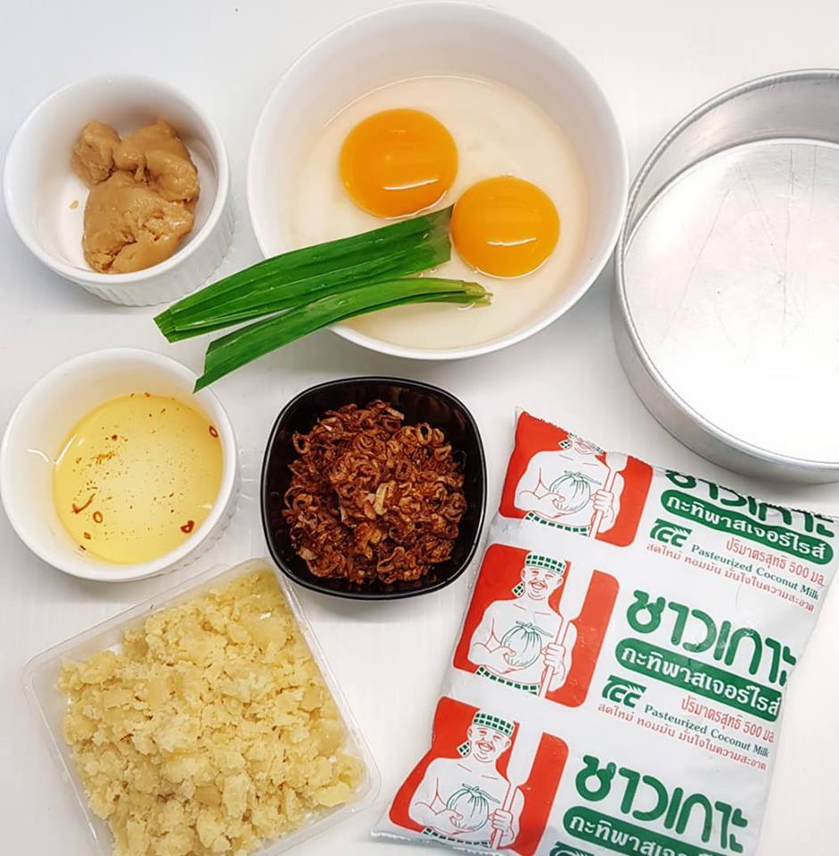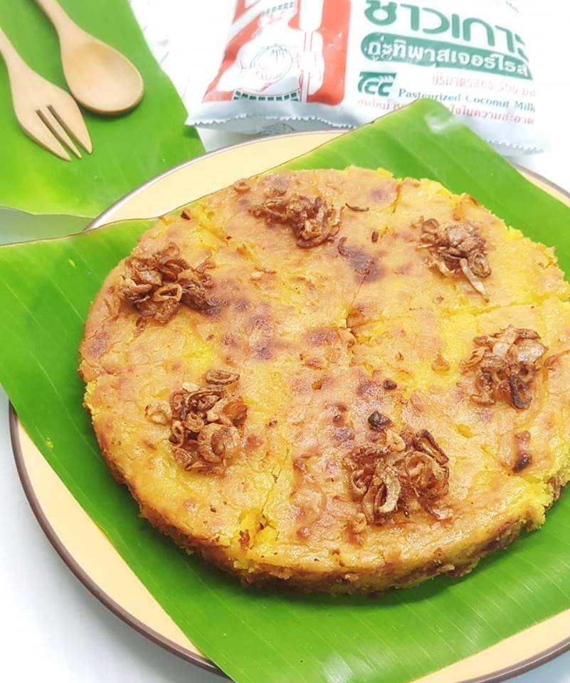 -รอขนมคลายตัว แกะออกจากพิมพ์ หั่ นตัดชิ้น โรยหน้าด้วยหอมเจียว เป็นอันเสร็จขั้นตอน