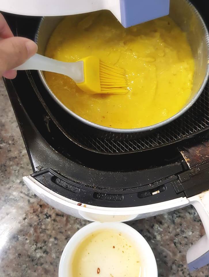 -10 นาทีผ่านไป หน้าขนมเริ่มตึง ให้เอาน้ำมันหอมเจียวทาหน้าขนมให้ขึ้นเ ง า แล้วอบต่ออีก 20 นาทีค่ะ