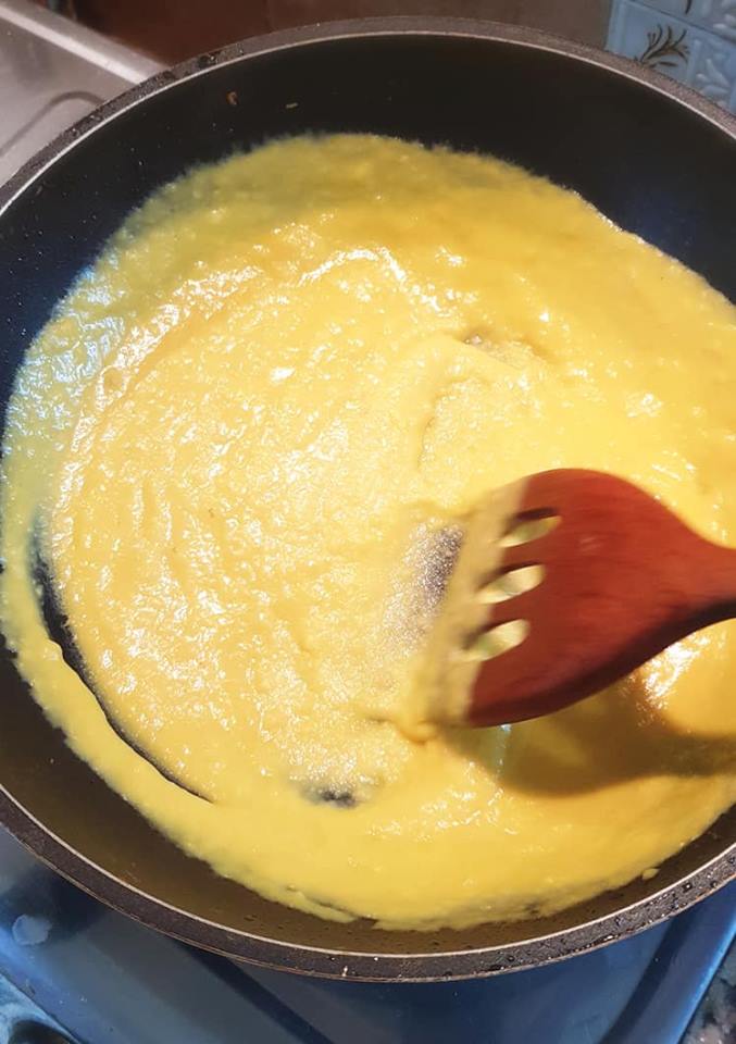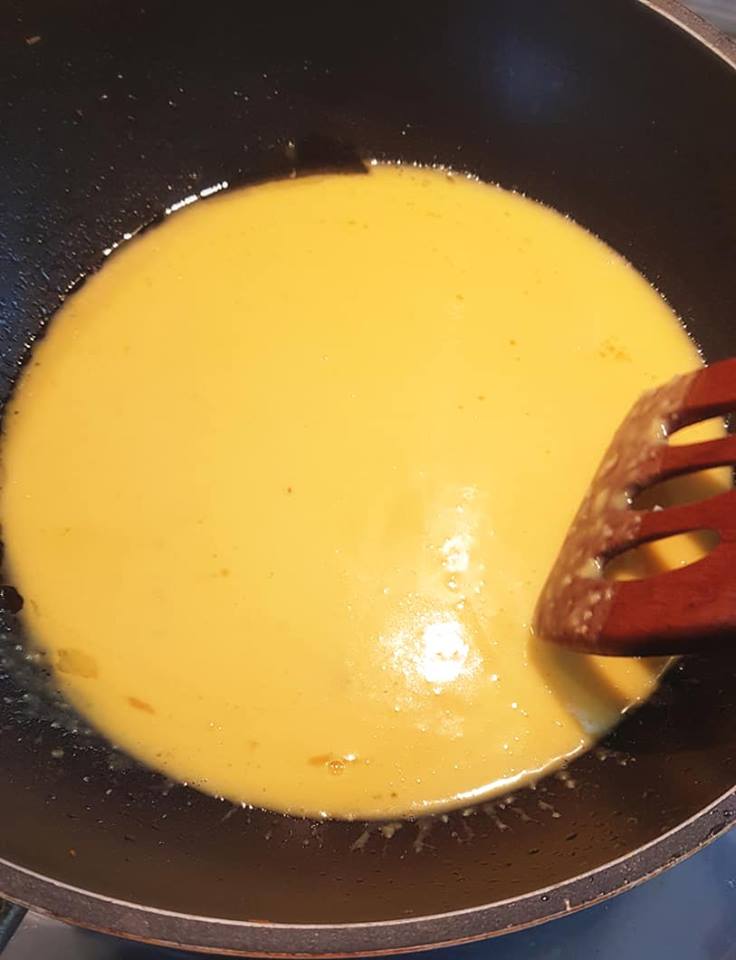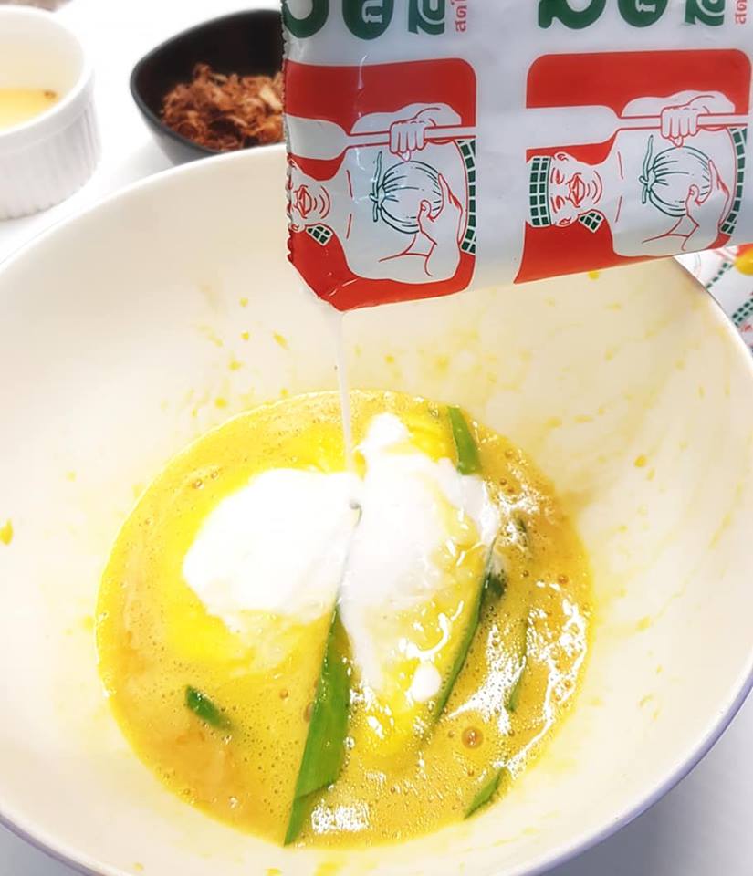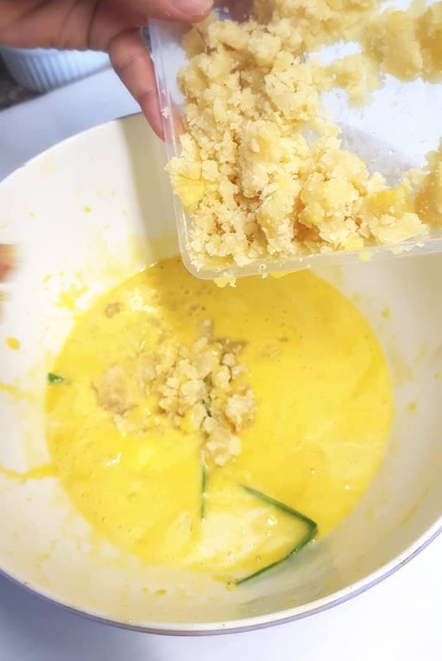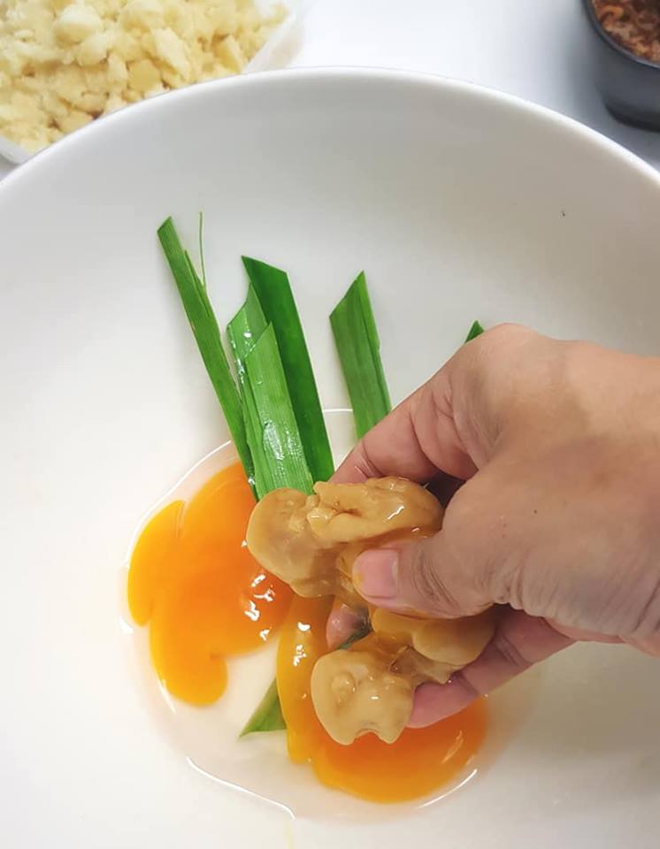 -ขยำไข่กับใบเตย น้ำตาล ให้ละลายรวมกันดี (ใบเตยจะดั บกลิ่นค าวของไข่ค่ะ )