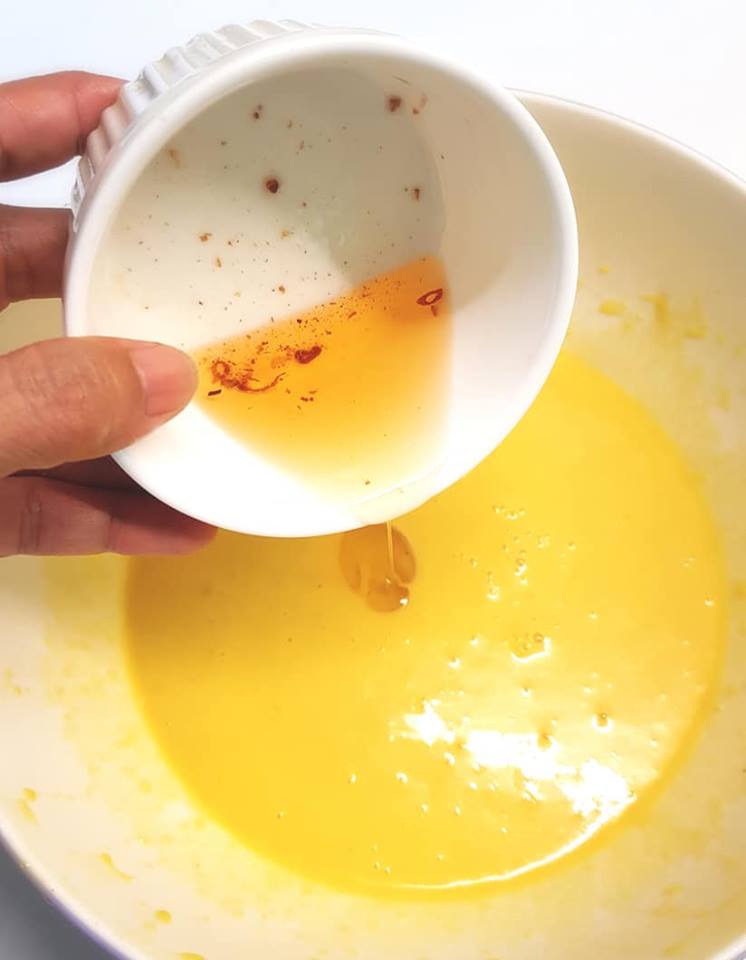 -ใส่น้ำมันเจียวหอม ลงในส่วนผสม รับรองหอมกลิ่นหอมเจียวถึงเ นื้ อใน (เหลือไว้บางส่วน)จากนั้นผสมให้ทุกอย่ างเข้ากัน จนเนียนข้น