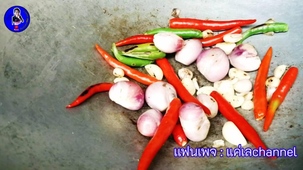 -ระหว่างนั้น​ ก็นำพริก​ หอมแดง​ กระเทียม​ คั่วด้วยไ ฟอ่อนๆ​ ให้สุ กเลยค่ะ