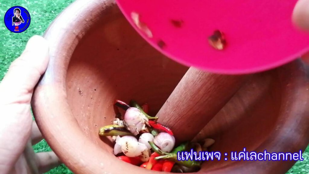 -เมื่อพริก​ หอมแดง​ กระเทียม​  สุ กแล้ว​ นำใส่ครกตำเลยค่ะ