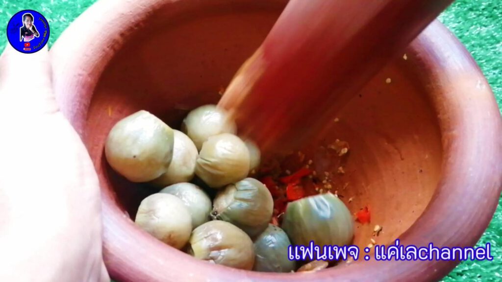 -ตามด้วยมะเขือเปราะที่เราต้มจนเ ปื่ อย​ ใส่ลงไปตำเลยค่ะ