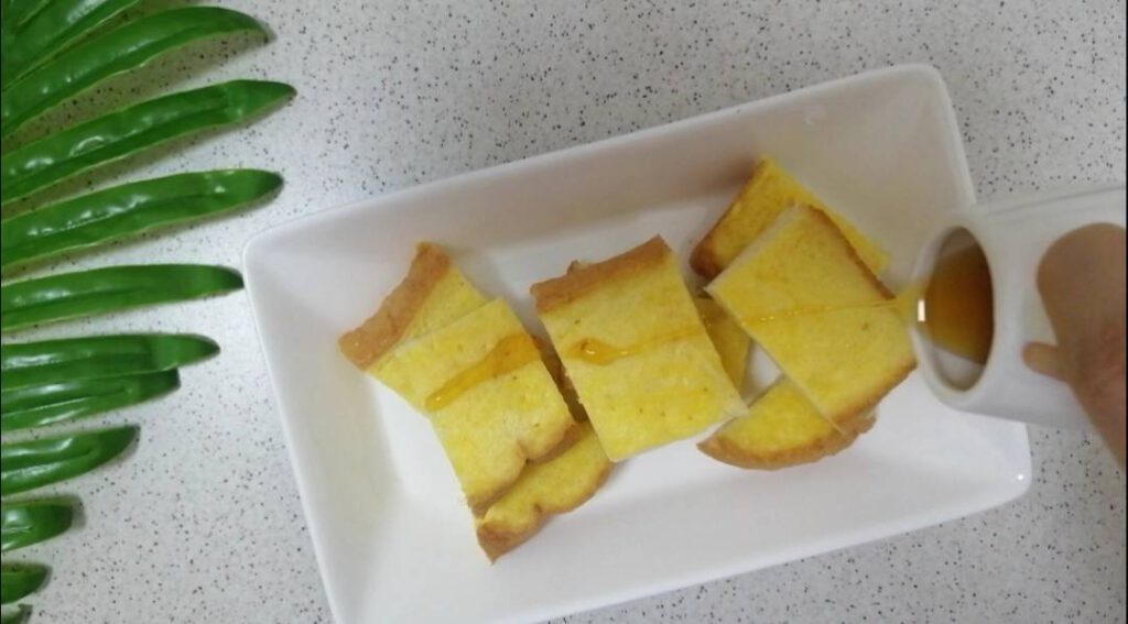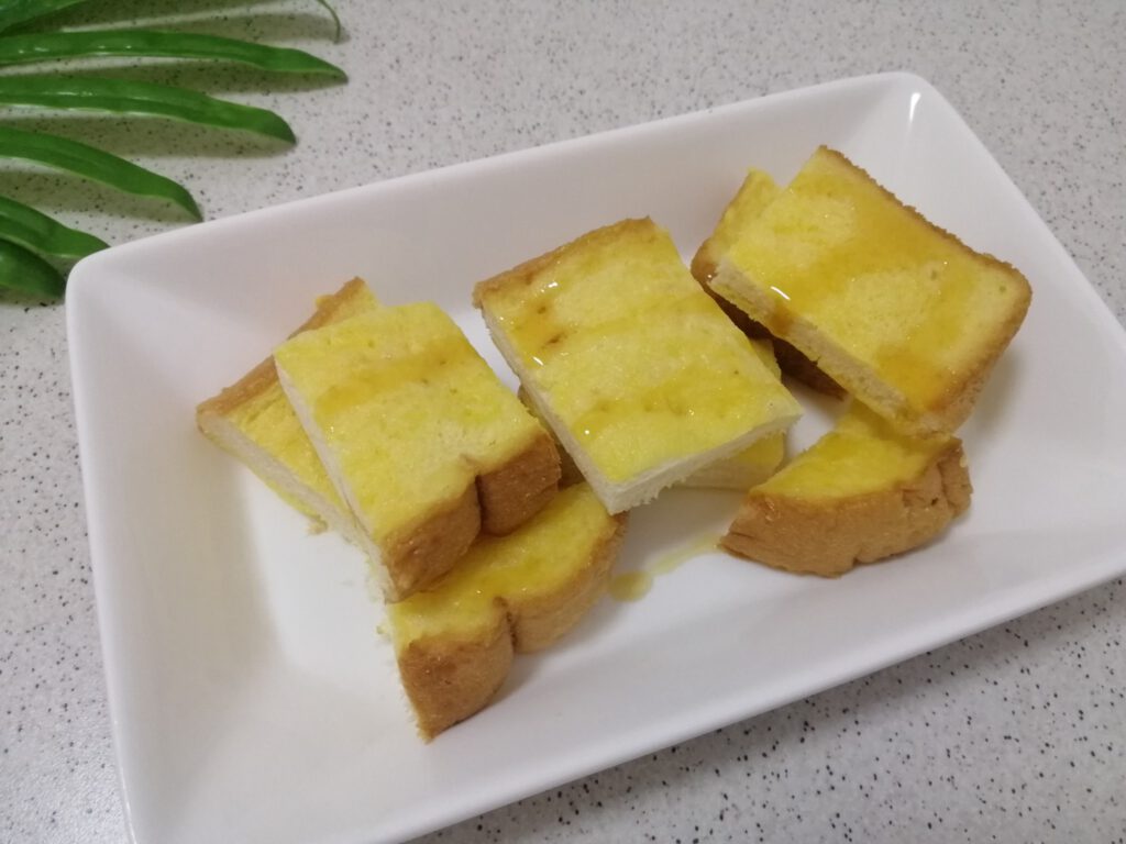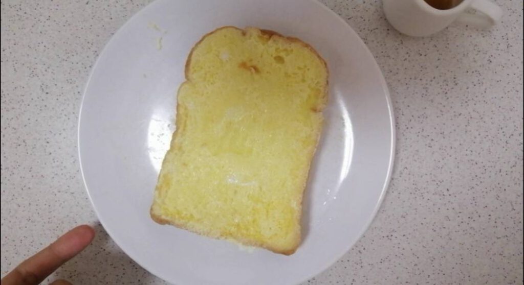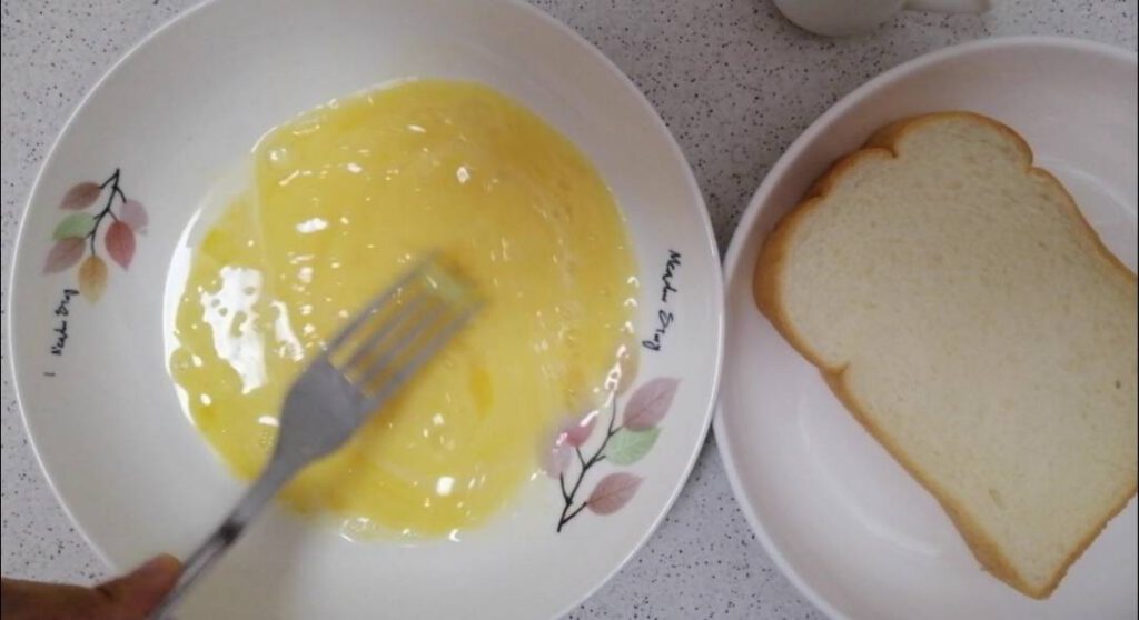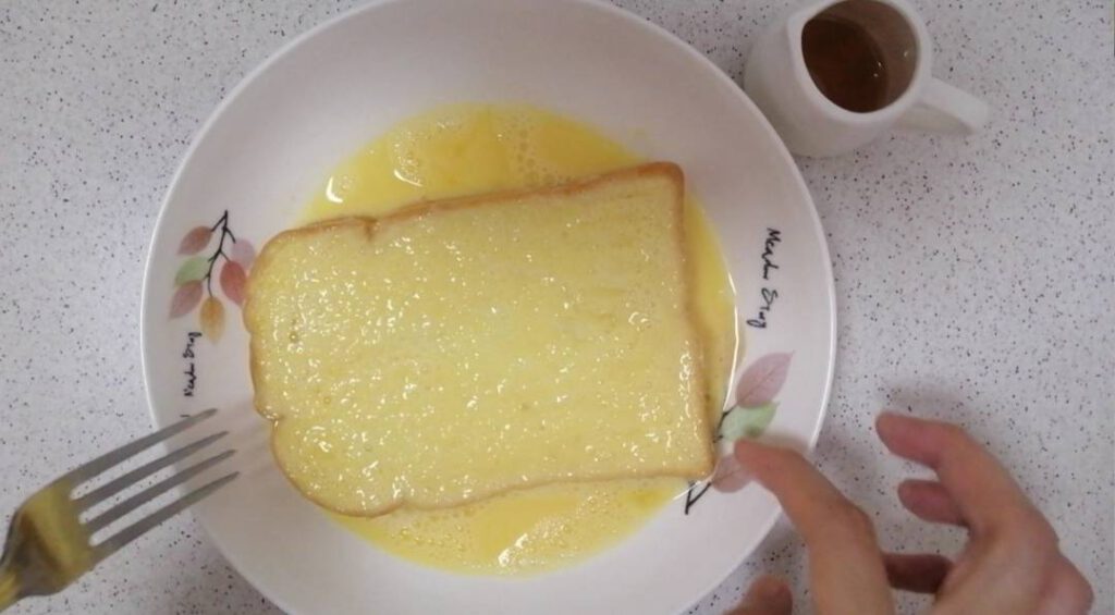 -เรียบร้อยแล้วให้นำขนมปั งลงไปชุบในไข่ พลิกกลับไปมาให้ขนมปั งดูซับไข่ให้ทั่วแผ่น