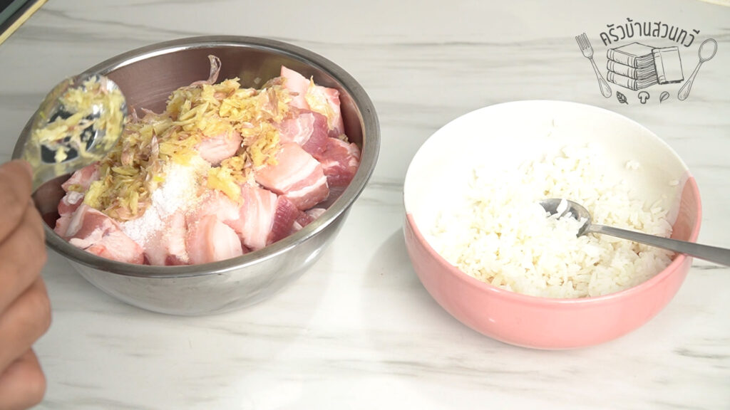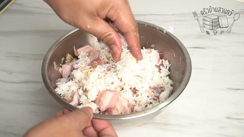 จากนั้นให้ใส่ข้าวสวยลงไปขยำให้เข้ากันดี ใช้เวลานวดซัก 5-7 นาที เพื่อให้ส่วนประกอบเข้ากัน