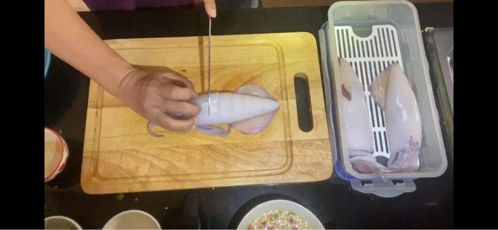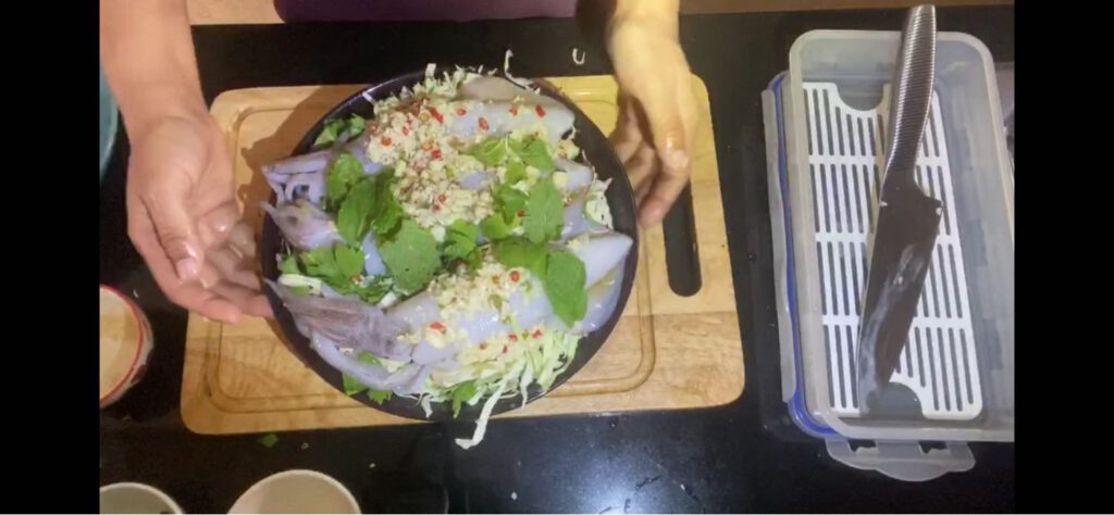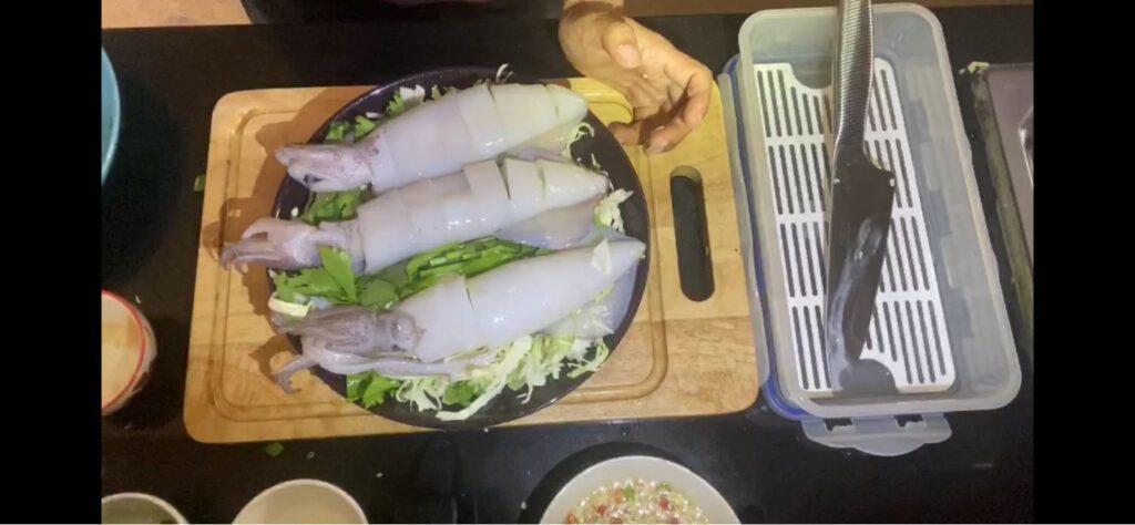 4.นำน้ำยำที่ผสมไว้แล้วมาราดบนตัวปล าหมึก
