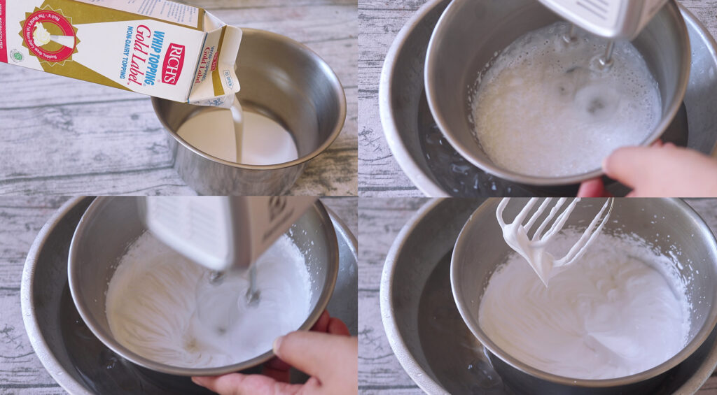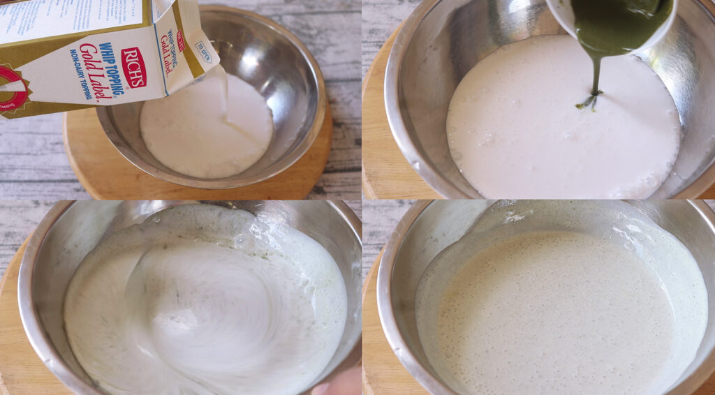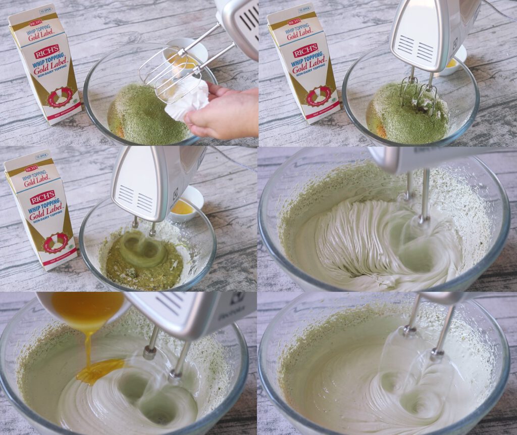 10.จากนั้น แบ่งวิปครีมที่ตีจนตั้งยอดแข็ง นำมาผสมในชามวิปปิ้งครีมที่ยังไม่ตี ผสมจนได้ความข้น เหลว ตามต้องการ
