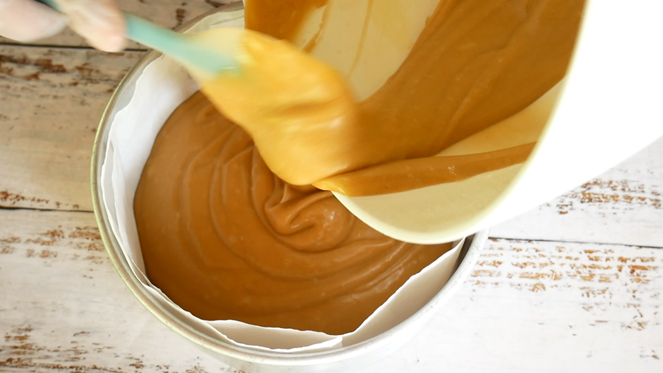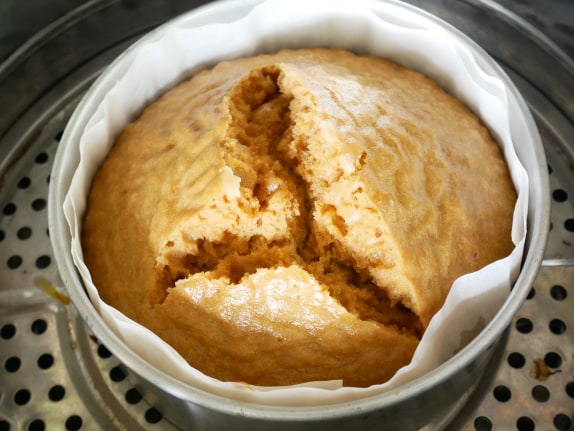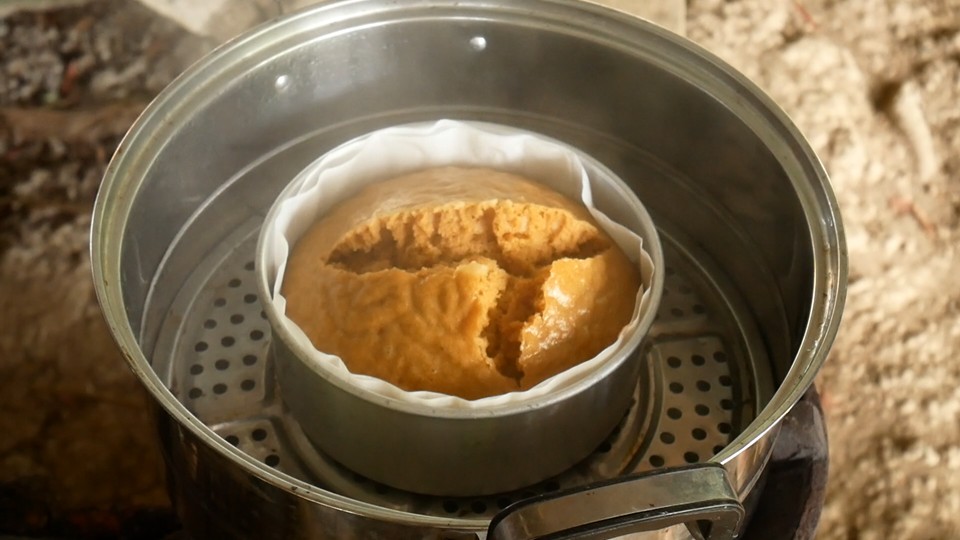 5. เทใส่พิมพ์ 1 ปอนด์ นำลงซึ้งที่ตั้งน้ำให้เ ดื อ ดแล้ว และนึ่งประมาณ 30 นาที ด้วยไ ฟปานกลาง จนเค้กสุ ก