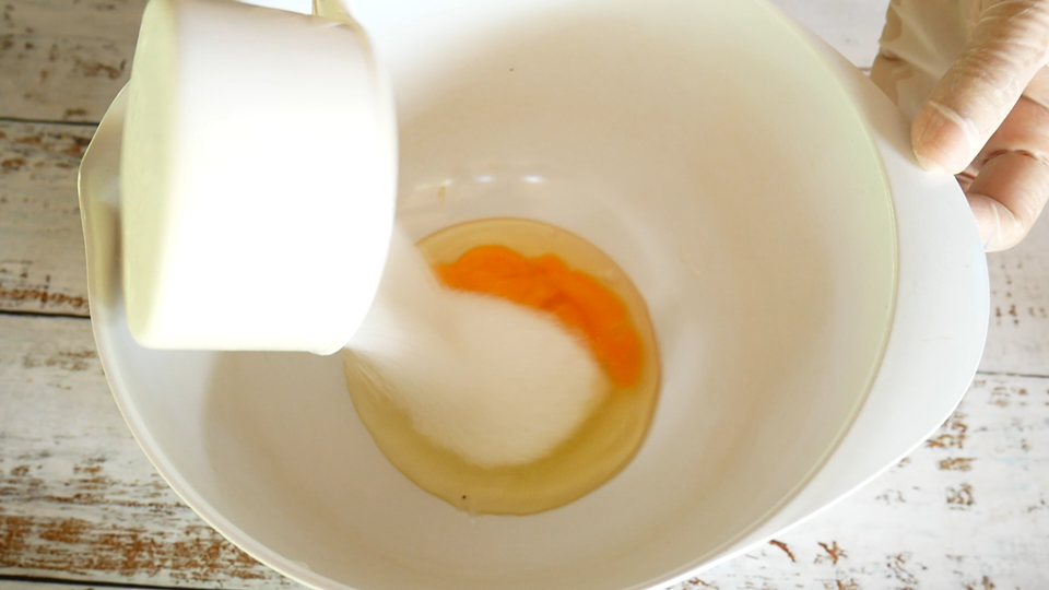 2. นำไข่ และน้ำตาลเทลงช ามผสม ใช้ตะกร้อตีไข่ คนให้ไข่และน้ำตาลทรายละลายจนเป็นสีเหลืองนวล