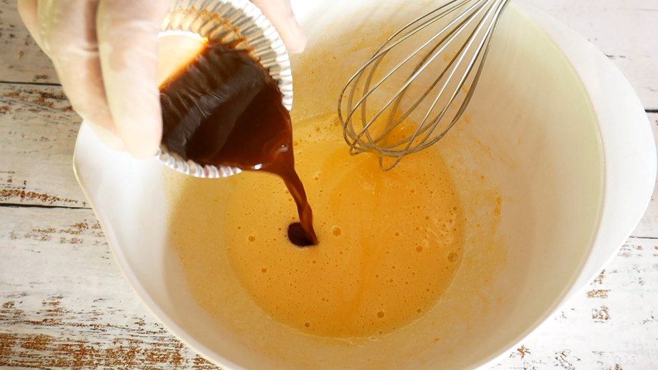 3. ใส่น้ำก าแฟ นมสดรสจืด เกลือ น้ำมัน กลิ่นวนิลา แล้วคนให้เข้ากัน พักไว้ซักครู่