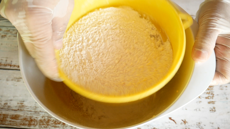 4. ร่อนแป้ง ผงฟู เบคกิ้งโซดา ลงในช ามผสม คนให้เข้ากัน ให้แป้งไม่เป็นเม็ดขาว