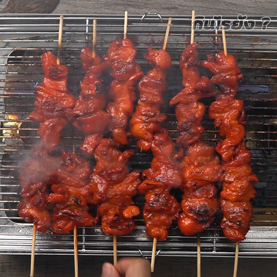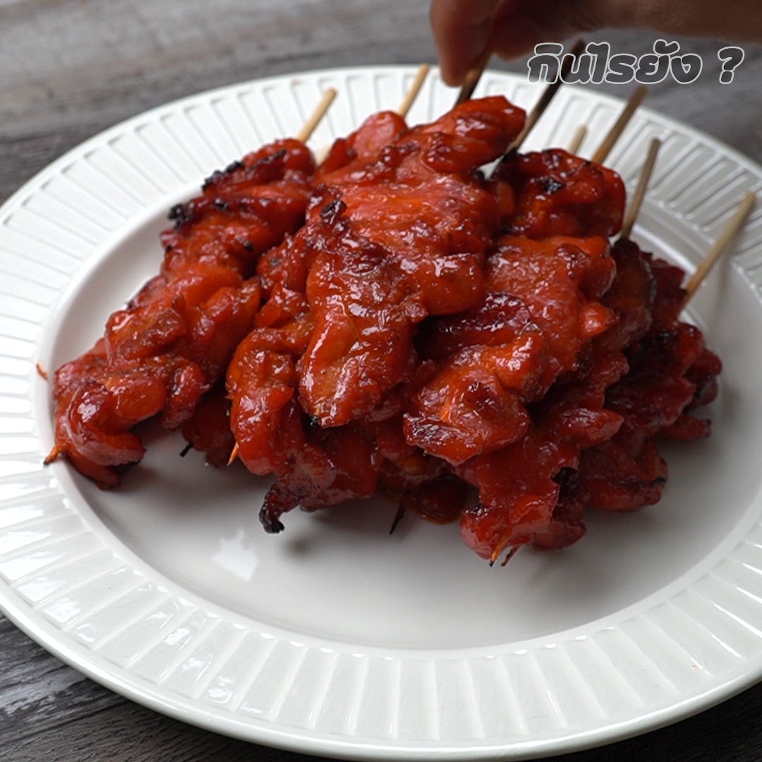 *ให้ไม้เ สี ยบแช่น้ำไว้ก่อนให้ชุ่ม เพื่อที่ไม้จะได้ไม่แห้งเพราะถ้าไม้แห้ง ไม้จะดูดน้ำในไก่ไปหมดทำให้เ นื้ อไก่แข็ง