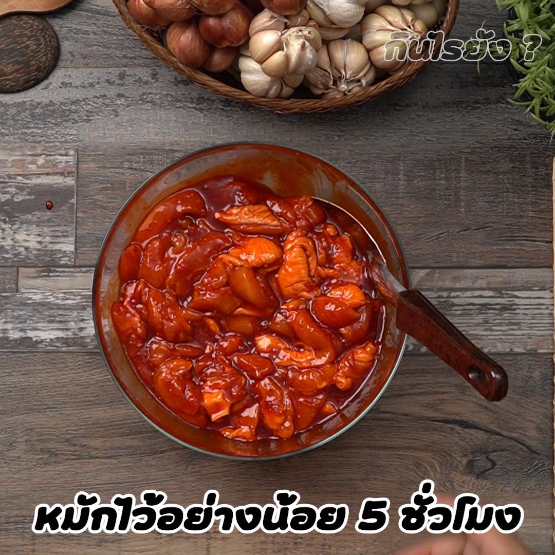 ใส่ผสมรวมกัน แล้วหมักไก่ทิ้งไว้อย่ างน้อย 5 ชั่วโมง แต่ถ้าจะให้ดีก็หมักทิ้งไว้ 1 คืน