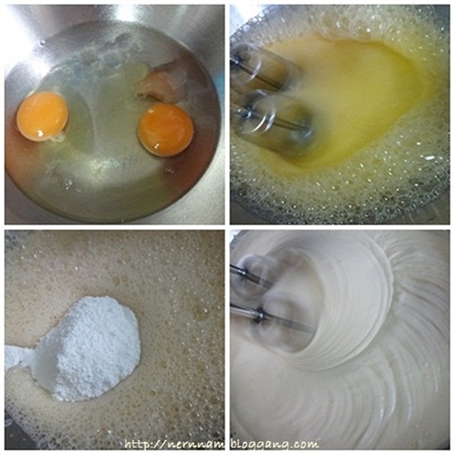 2. ตีไข่ น้ำ เอสพี และน้ำตาลให้ขึ้นฟูขาวเนียน ใช้ความเร็วปานกลาง ประมาณ 5 นาที