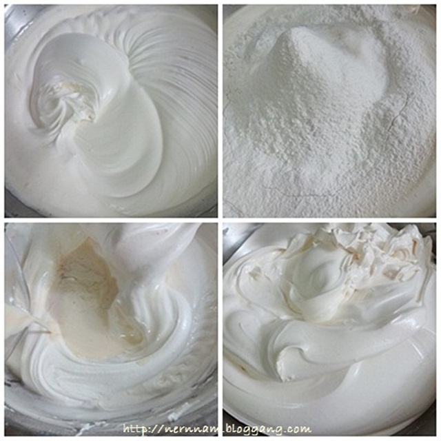 3. ใส่แป้งที่ร่อนไว้ เปลี่ยนเป็นความเร็วต่ำ ประมาณ 1 นาที