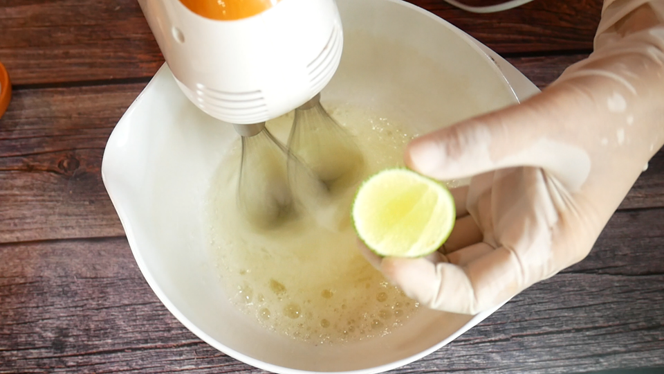 1.เทไข่ขาวลงช ามผสม ตีด้วยความเร็วปานกลางซักครู่ เมื่อขึ้นฟองหย าบใส่น้ำมะนาว 3-4 หยด เพื่อให้ไข่ทรงตัวได้ดี