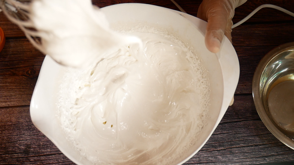 2. ตีต่อซักครู่ทยอยใส่น้ำตาลทรายทีละน้อยสลับกับการตีจนน้ำตาลหมด ตีจนเมอแรงก์ตั้งยอด