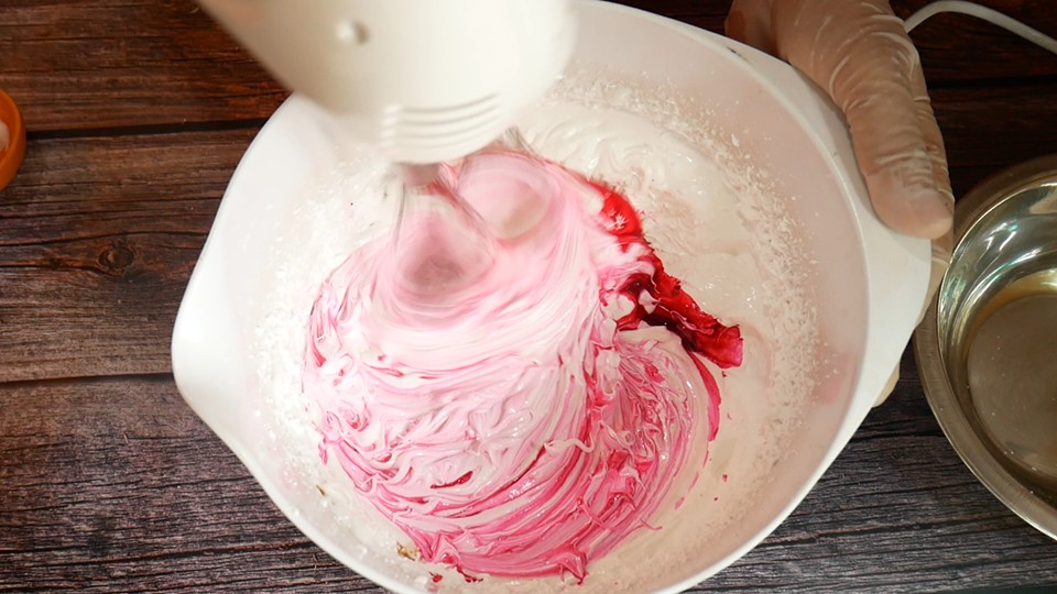 3. ใส่กลิ่นวนิลา สีผสมอาหารตามชอบ ตีต่อซักครู่ให้เข้ากัน