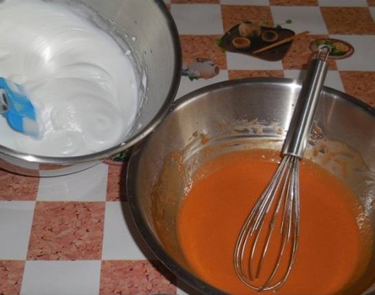 3.ตีไข่ขาวให้ขึ้นฟองห ย าบๆ ใส่น้ำมะนาวลงไป ตีให้เข้ากัน ทยอยใส่น้ำตาลลงไป ตีด้วยความเร็วสูง ให้ส่วนผสมมีลักษณะตั้งยอดแข็ง