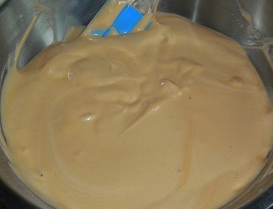 2.ผสมไข่แดง น้ำตาลทรายครึ่งหนึ่ง คนให้เข้ากัน ใส่น้ำช าไทย คนให้เข้ากัน