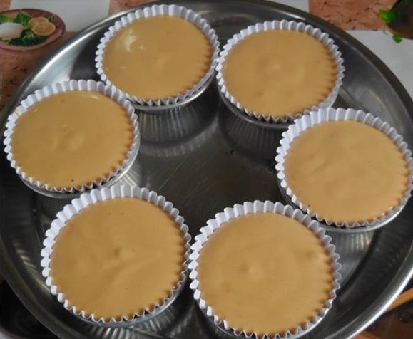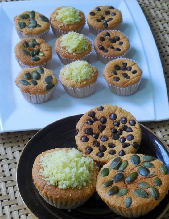 5.ใส่ส่วนผสมลงในพิมพ์ ใส่เม็ดฟั กทอง ช็อกโกแลตชิฟ (หน้าชีสใส่หลังอบขนมสุ กแล้ว)