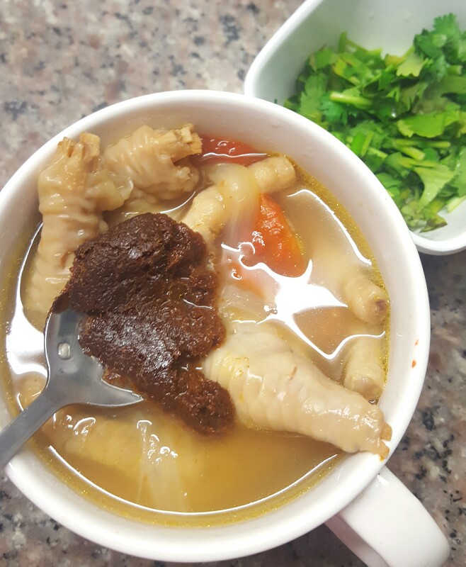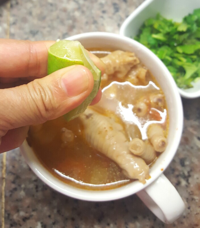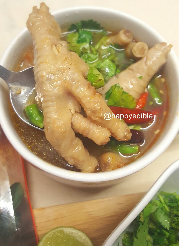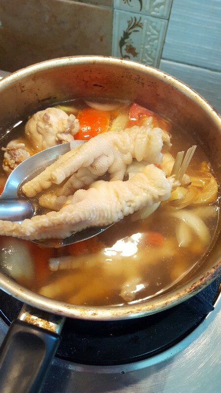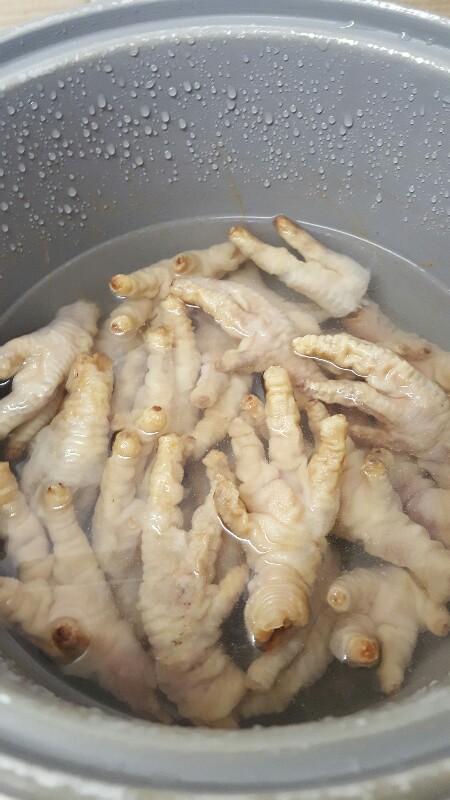 1.ล้างข าไก่ให้สะอาด นำไปอบในหม้อลมร้ อ น หรือทอดในหม้อทอดไร้น้ำมัน สุ กแล้วแช่น้ำ1คืน