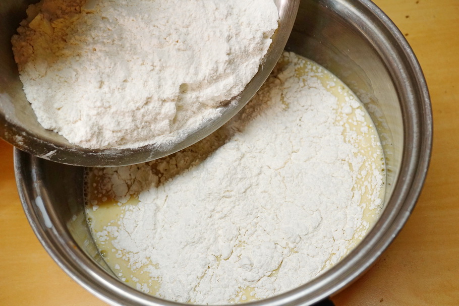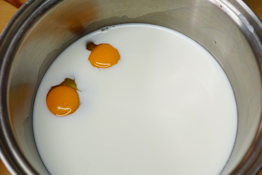 1.ในหม้อ มีนมสด 350ml + ไข่ไก่ 2 ฟอง + น้ำตาลทราย 130กรัม = คนผสมให้เข้ากัน