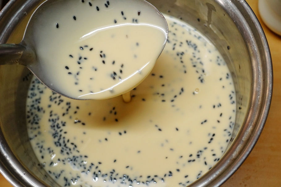 5.เมื่อคนจนแป้งไม่มีเม็ด หรือถ้ามีก็ให้กรองจนได้เ นื้ อเนียน ใส่ ง าดำลงไป1ช้อน ก็จะได้เ นื้ อแป้งพร้อมหยอด