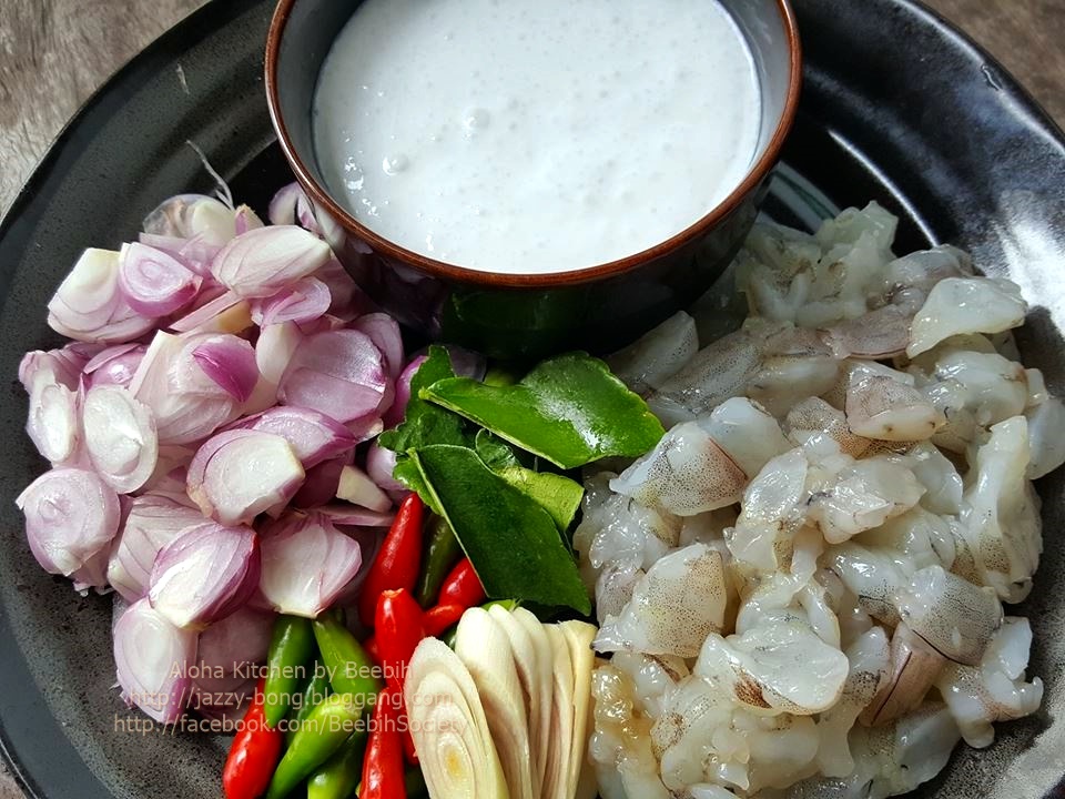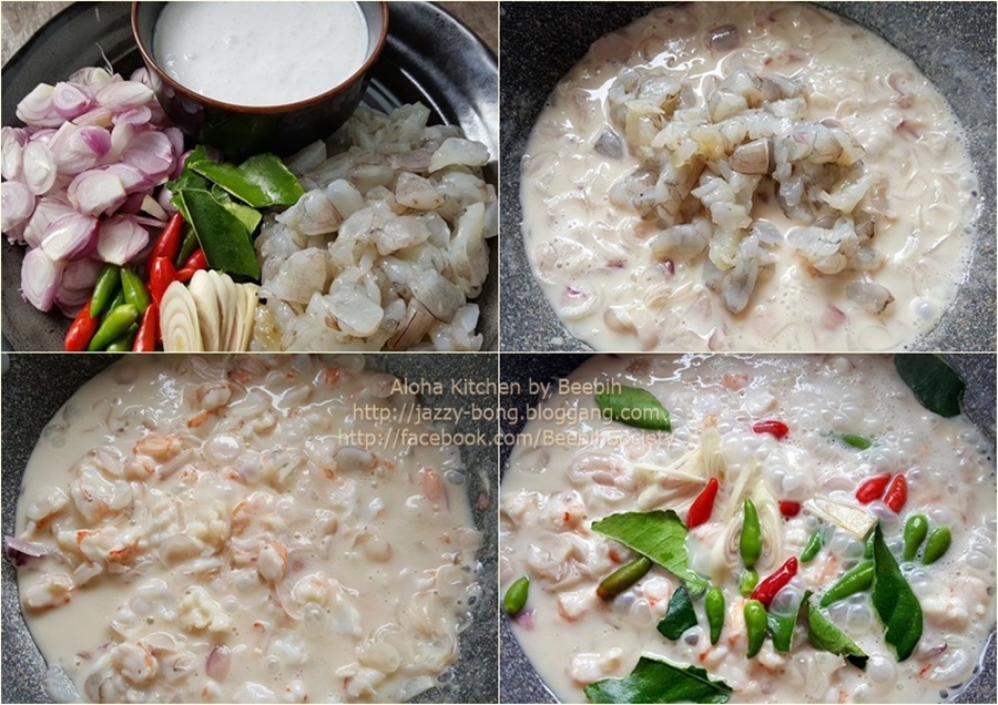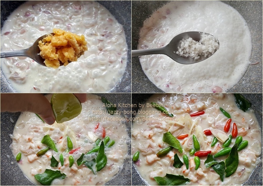 5 ใส่เ นื้ อกุ้งสั บ (หั่ น) ลงไป เร่งไ ฟให้หลนเ ดื อ ดแล้วใส่กะทิส่วนที่เหลือลงไป 6 ใส่ตะไคร้หั่น แ ฉ ล บ