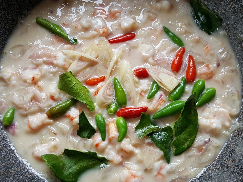 ชนิดโขลกหยาบบางส่วนลงไปต้มกับกะทิก่อน ถ้าชอบพริกนิ่ม ๆ ใส่พริกทั้งเม็ดไปตอนนี้