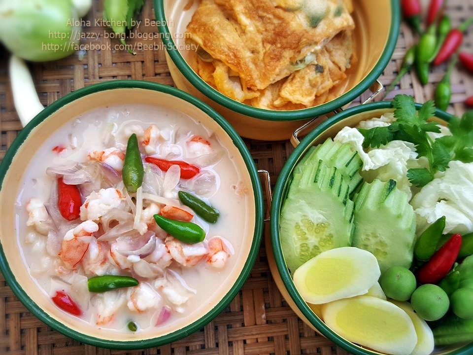 ผักสดต่าง ๆ ข มิ้ นขาว มะเขือ แตงกวา ยอดมะม่วง อื่น ๆ ตามชอบ