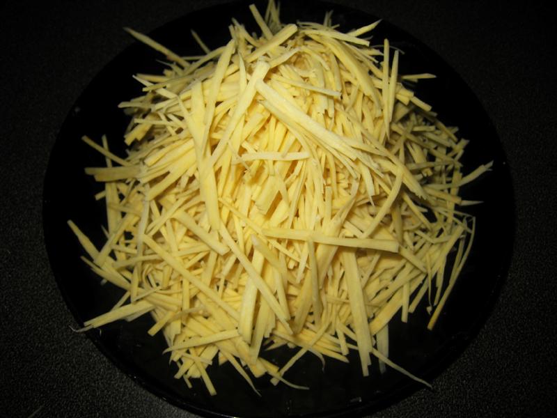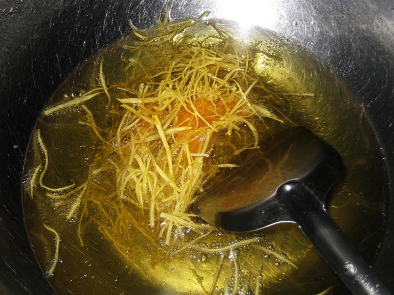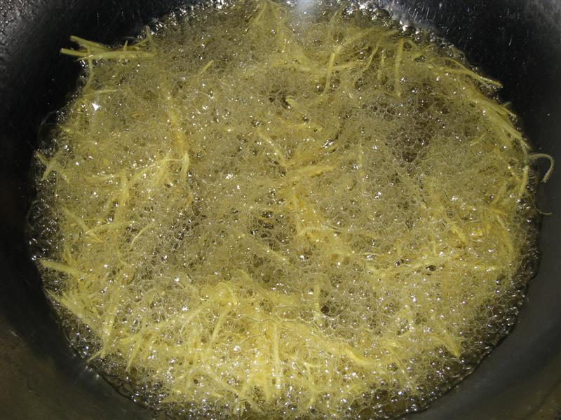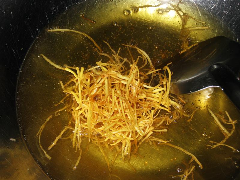 -พอน้ำมันเริ่มร้ อ น ใส่มันเส้นที่หั่ นลงไปพอประมาณ กะได้ก้อนกลมพอดี
