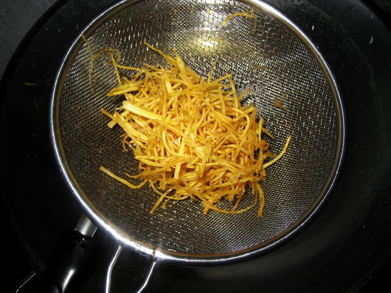 -พอมันเหลือง ออกไปทางจะเข้ม ใช้กระชอน ตาถี่ ตักขึ้น ระหว่างนั้น ใช่ตะหลิว ตะล่อมตะล่อม ให้เป็นก้อนกลม ๆ