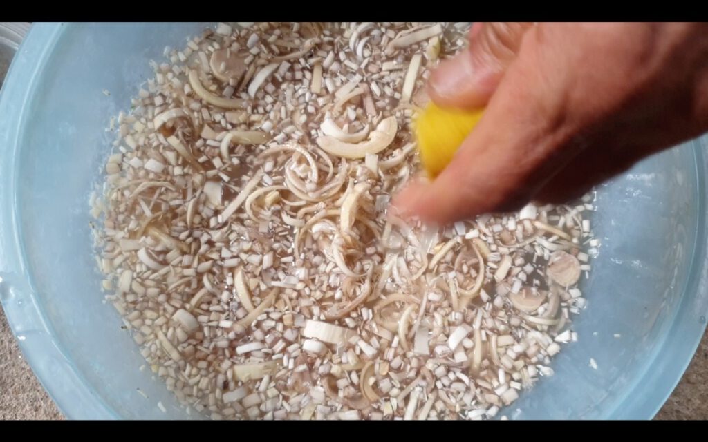 1.นำหัวป ลีมาหั่นตามภาพค่ะ แล้วแช่น้ำเกลือ บี บมะนาวลงไป ขยำหัวปลีหน่อย จะช่วยให้หัวป ลีไม่ดำคล้ำค่ะ