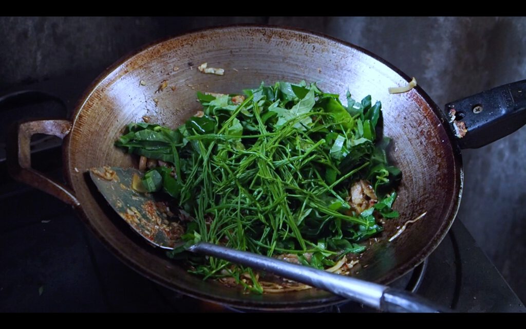 6.ขั้นตอนสุดท้ายใส่ใบชะพลู และชะอม ปิดไ ฟ คนให้เข้ากัน ผักจะสลบ และมีสีสันที่น่าทานมากค่ะ