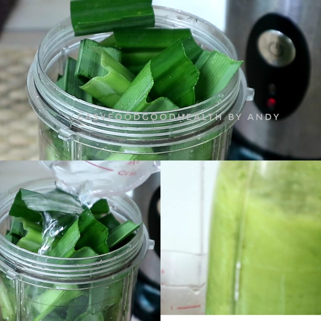 1.ปั่นใบเตยกับน้ำมะพร้าว200มล. แล้วนำมากรองให้เหลือแต่น้ำ