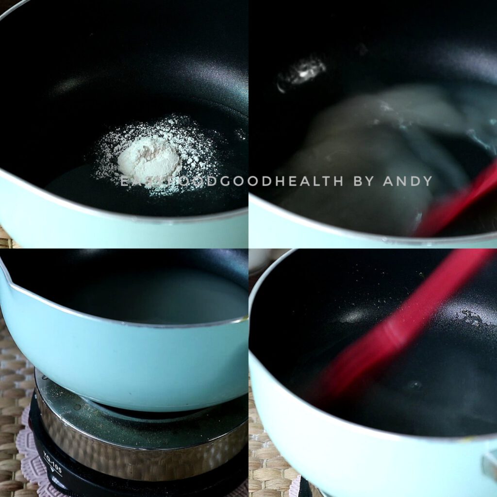 เมื่อผงวุ้นอิ่มน้ำคนจนละลายนำขึ้นตั้งไ ฟใช้ไ ฟอ่อนคนจนผงวุ้นละลายจนหมด