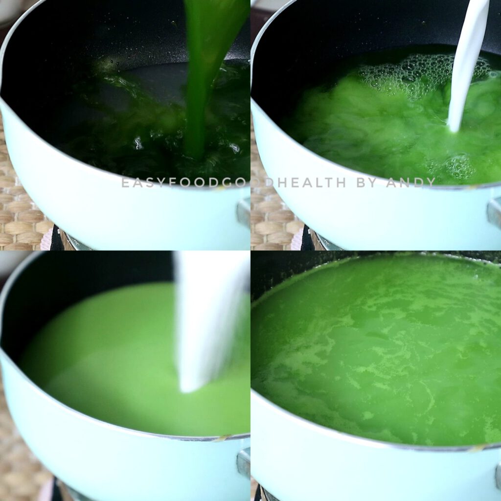 3.นำน้ำใบเตยใส่ลงไปตามด้วยกะทิคนให้เข้ากัน